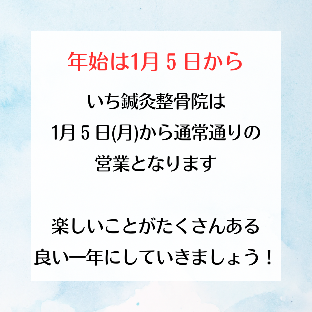 いち鍼灸整骨院は1月5日から通常通り営業いたします 公開日:2026年1月4日 お知らせ いつもブログを見ていただきありがとうございます。 年末年始のお休み、あなたの体はどんな時間を過ごしていましたか? 「少し楽になった気もするけど、動き出したらまた痛みそう…」 「休み明けが近づくと、体より先に不安が出てくる […] 続きを読む