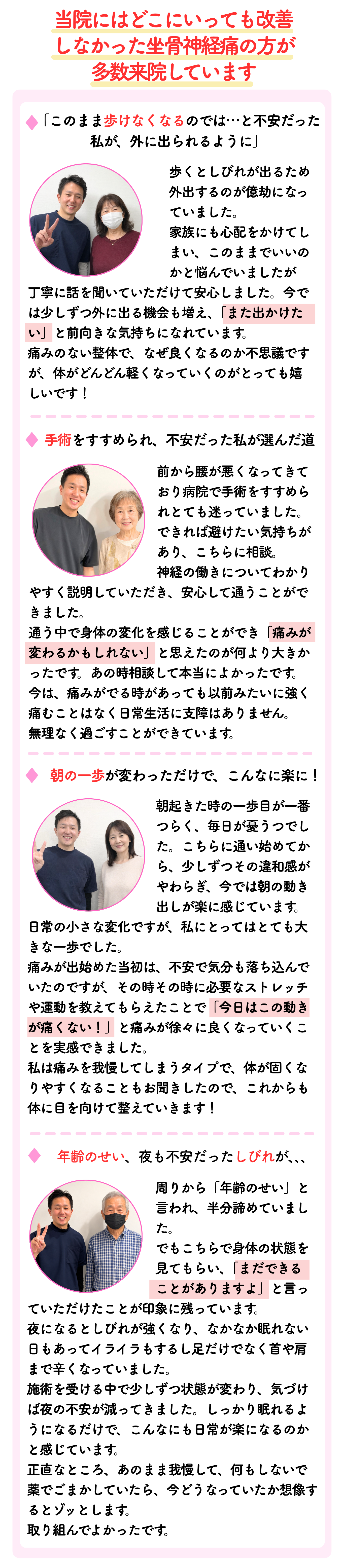 ご記入していただくことで、ポイントを突いた問診と施術ができるようになり、より早く良い結果へと結びつきます。